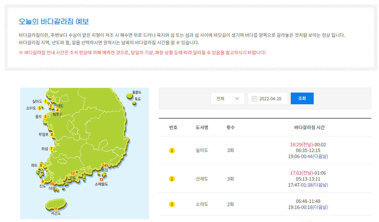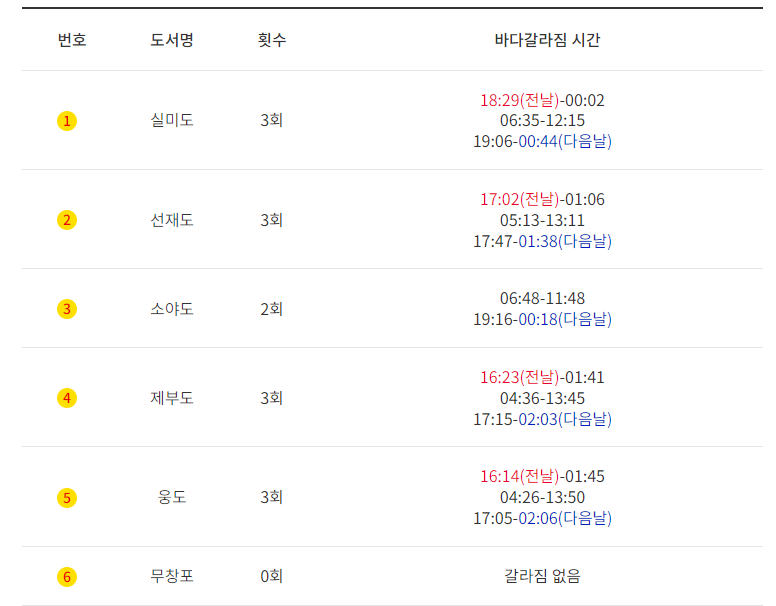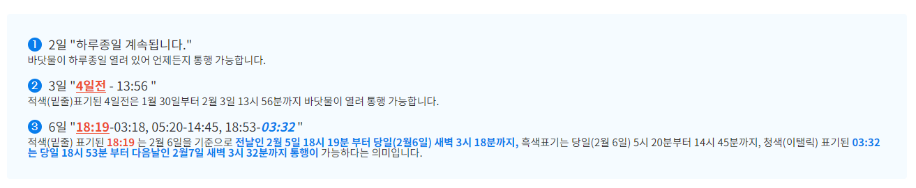 그리고 만약에 갈라짐이 없는 경우 시간이 나와있지 않고 갈라짐 없음이라고 되어 있을 것입니다. 그리고 만약에 하루종일 갈라져 있다면 하루종일 계속됩니다 라고 설명되어 있을 것입니다.