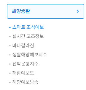 무엇을 클릭하여야 제부도 물때시간표를 확인할 수 있는지 아시겠나요? 바로 맨 왼쪽에 있는 해양생활 메뉴를 이용하시면 됩니다.