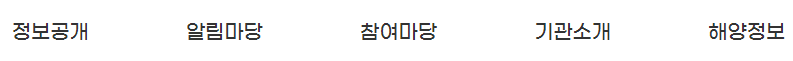 홈페이지에 접속하시면 여러가지 메뉴들이 보일 것입니다. 여기서 위쪽을 보면 정보공개, 알림마당, 참여마당, 기관소개, 해양정보 등이 보일 것입니다.