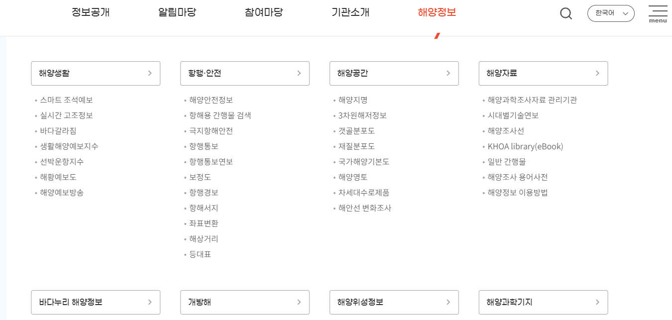 해양정보에 마우스를 올려놓으시면 이렇게 해양생활, 해양공간, 항행,안전, 해양자료 등이 보입니다.