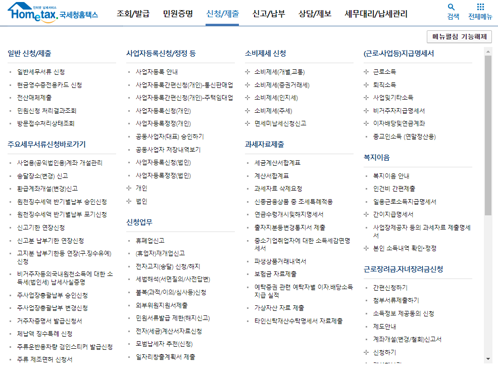 마우스 커서를 올려놓으시면 홈택스 홈페이지에서 할 수 있는 모든 신청/제출 메뉴들이 나오게 됩니다.
