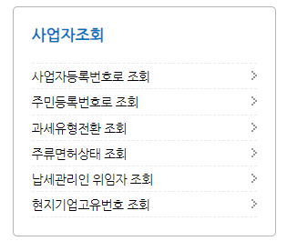 사업자 조회를 보시면 사업자등록번호 조회, 주민등록번호로 조회 등 다양한 조회가 보입니다.