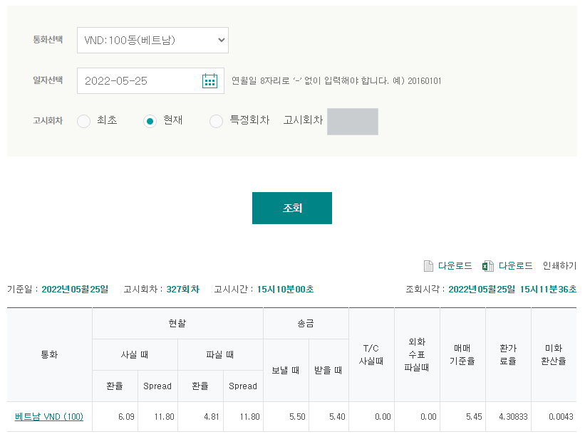 베트남 100동을 클릭한 후 조회를 해보았습니다.