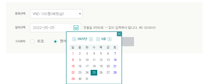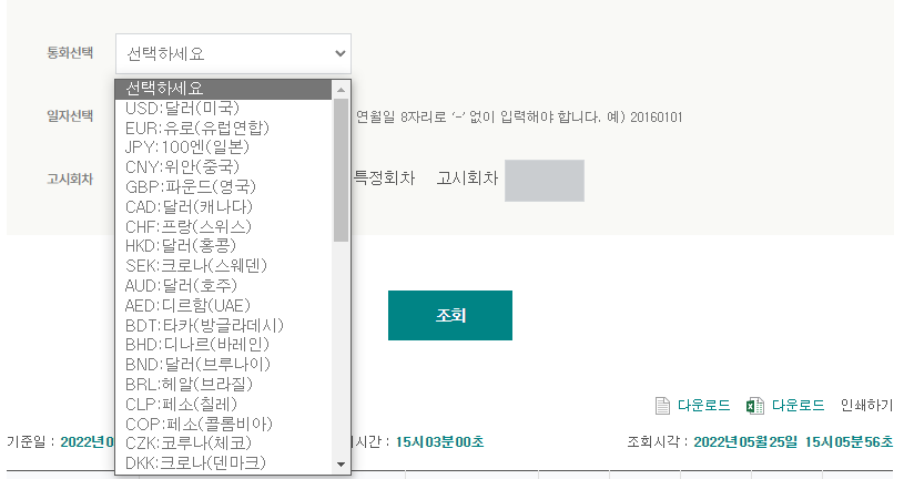 일자를 선택하면 특정 날짜의 환율조회를 하실 수가 있습니다.