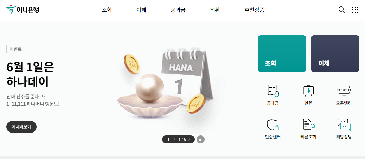 외환은행 환율조회를 위해서는 먼저 하나은행 홈페이지에 접속을 해주셔야 합니다. 외환은행 환율조회인데 왜 하나은행에 접속하는 건지 의문을 가지시는 분들도 있을테지만 간략하게 설명드리면 하나은행과 외환은행이 합병되었다고 생각하시면 됩니다. 더 자세한 내용은 검색을 통해서 확인해주시기 바랍니다.