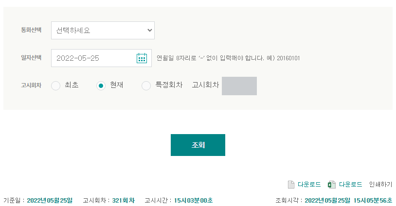 클릭하신 후 조회 버튼을 클릭하면 특정 통화의 환율을 아래쪽에서 확인할 수가 있습니다.