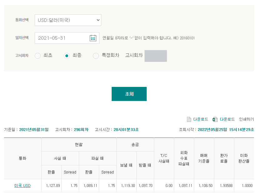 2021년 5월 31일 달러의 환율을 조회해보았습니다.