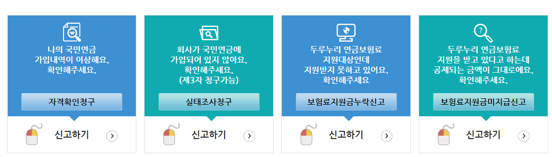 만약에 국민연금 가입내역이 이상할 경우 자격확인 청구 신고를 하시고 국민연금에 가입되어 있지 않다면 실태조사 청구를 하셔서 확인을 해보시기 바랍니다.