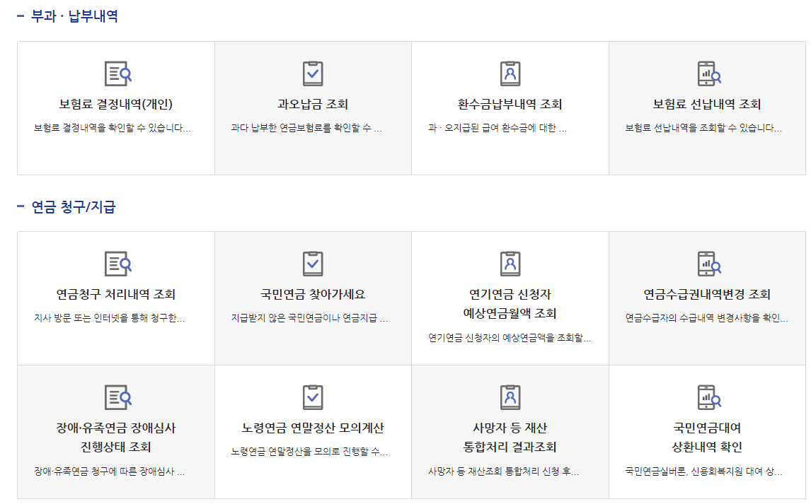 국민연금 가입내역조회, 예상연금액 조회, 예상연금 모의계산, 장애, 유족 예상연금 조회 등이 보일 것입니다.