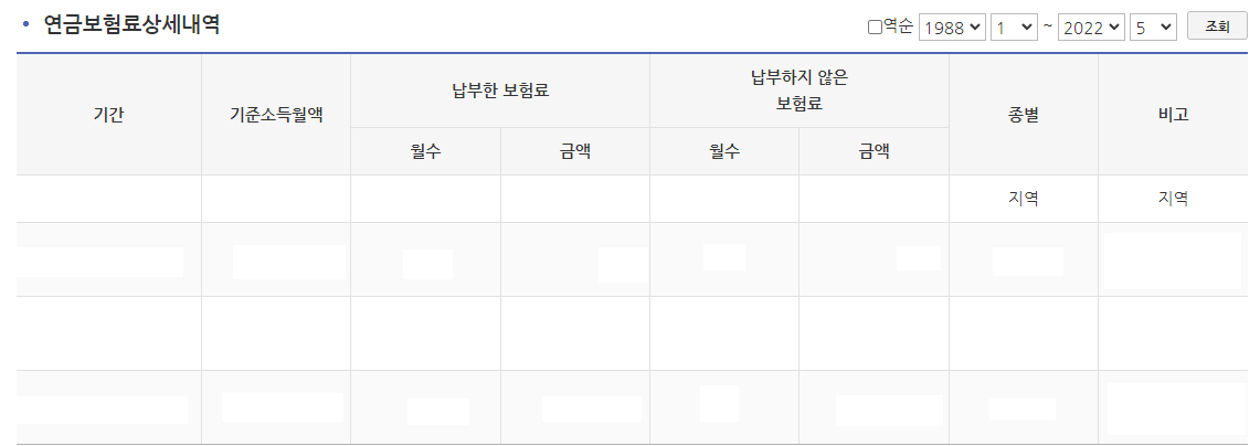 기간별 기준소득월액, 지역가입자인지 직장가입자인지, 지역가입자 였을 때 납부했었던 금액, 직장가입자일때 납부했었던 금액 등 아주 상세하게 확인할 수가 있습니다.