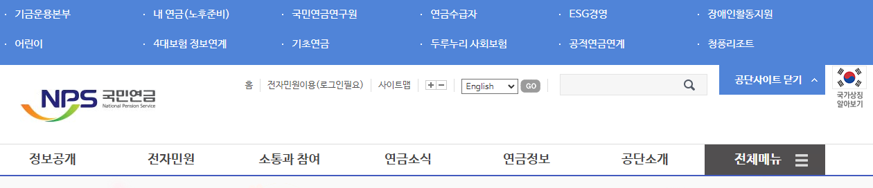 홈페이지에 접속하시면 정보 공개, 전자민원, 소통과 참여, 연금소식, 연금 정보 등이 보일 것입니다.