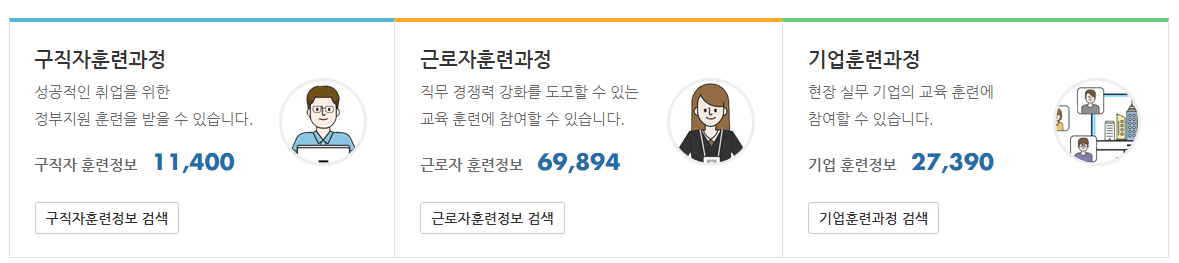 훈련정보를 클릭하시면 구직자 훈련과정, 근로자 훈련과정, 기업 훈련과정 등이 보입니다.