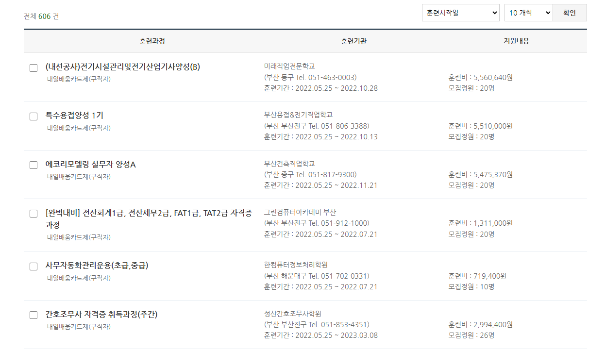 그러자 총 606건이 검색이 되었으며 훈련과정 명, 기관, 지원내용이 보입니다.