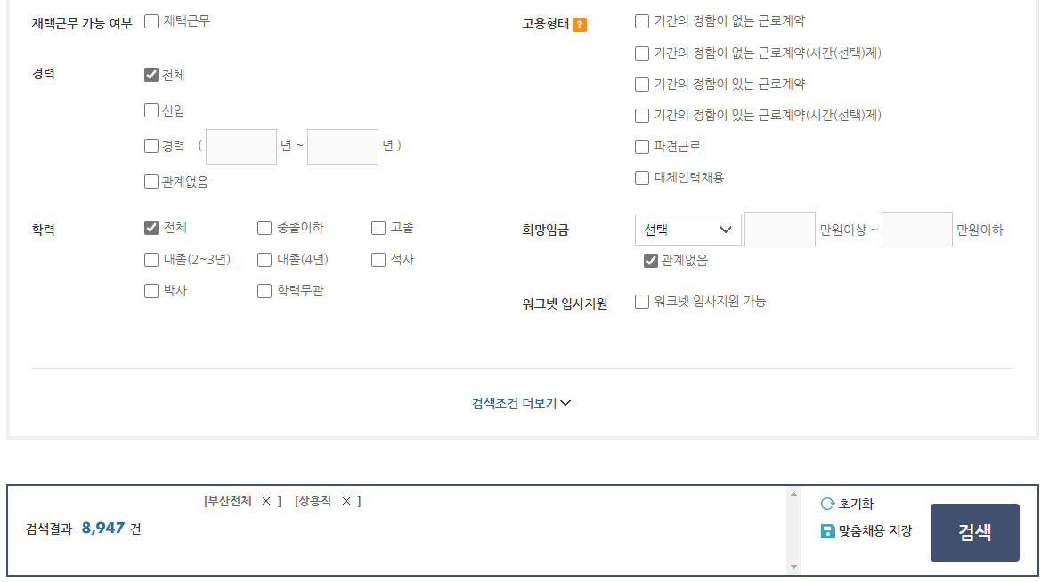 그리고 아래로 조금 내리시면 경력, 학력, 희망임금, 고용형태를 선택할 수 있는 창이 보이실텐데 선택 후 오른쪽 아래에 보이는 검색 버튼을 클릭하시면 됩니다.