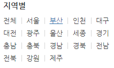 지역별 메뉴에서 저는 제2의 도시인 부산을 클릭해보도록 하겠습니다.