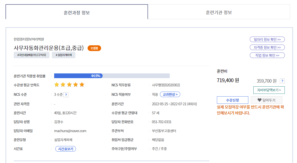 클릭하시면 만족도, 훈련비 등을 확인하실 수가 있으며 아주 자세한 내용들을 살펴보실 수가 있습니다.