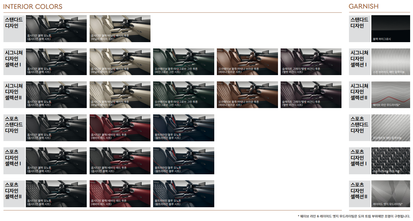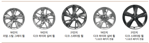 아까 설명드렸듯이 스탠다드 디자인, 시그니쳐 디자인 셀렉션, 스포츠 스탠다드 디자인, 스포츠 디자인 셀렉션이 있고 각 디자인 별로 블랙 하이그로시, 스핀 브러쉬드 패턴 알루미늄, 웨이브 라인 무드라이팅, 지오매트릭 패턴 알루미늄 등으로 되어 있는데 자세한 내용은 위 사진을 확대하셔서 확인하시기 바랍니다.