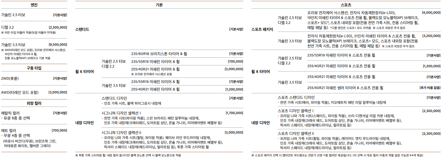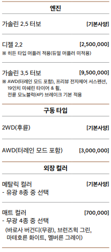 필수 선택 사양중에서 엔진에는 기본 사양인 가솔린 2.5 터보, 디젤 2.2, 가솔린 3.5 터보, 구동 타입에는 2WD, AWD, 외장컬러는 메탈릭컬러 유광 8종, 매트 컬러 무광 4종이 있습니다. 엔진, 구동 타입, 외장 컬러중에서 하나를 선택하여야 합니다.