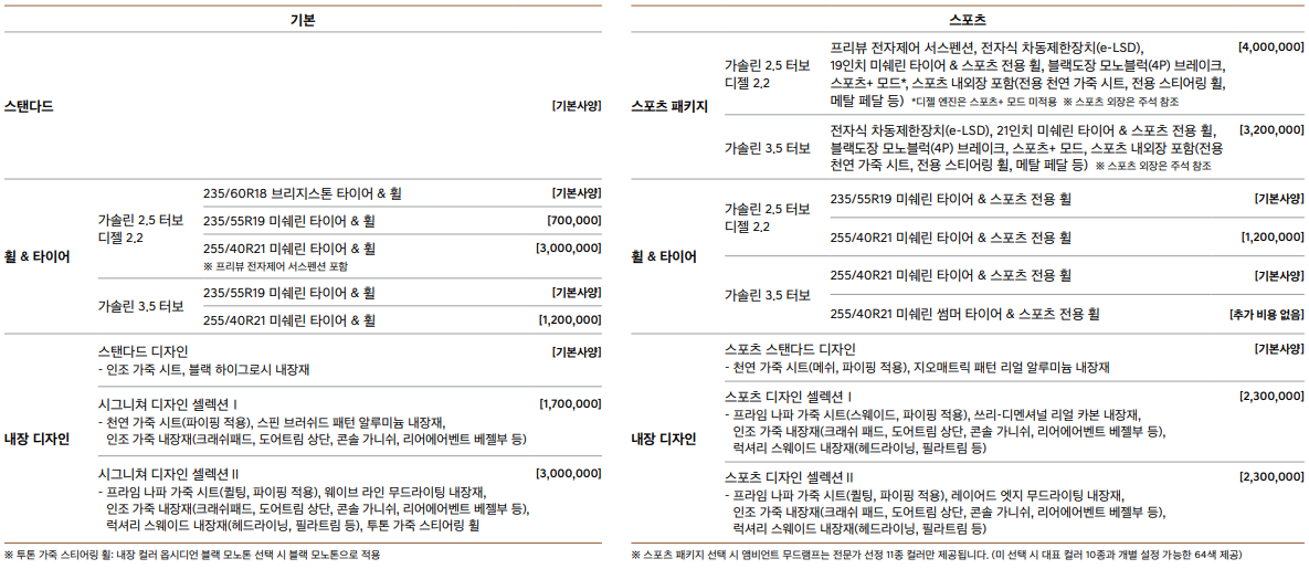 기본을 선택할 경우 스탠다드, 휠 & 타이어에서는 235/60R18 브리지스톤 타이어 & 휠, 235/55R19 미쉐린 타이어 & 휠, 255/40R21 미쉐린 타이어 & 휠,  내장 디자인에서는 스탠다드 디자인, 시그니쳐 디자인 셀렉션Ⅰ, 시그니쳐 디자인 셀렉션Ⅱ를 선택할 수 있습니다.
