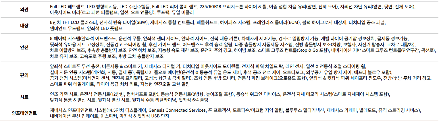 내장은 8인치 TFT LCD 클러스터, 전자식 변속 다이얼(SBW), 제네시스 통합 컨트롤러, 패들쉬프트, 하이패스 시스템, 프레임리스 룸미러(ECM), 블랙 하이그로시 내장재, 터치타입 공조 패널, 앰비언트 무드램프, 앞좌석 LED 풋램프, 외관은 Full LED 헤드램프, LED 방향지시등, LED 주간주행등, Full LED 리어 콤비 램프, 235/60R18 브리지스톤 타이어 & 휠, 이중 접합 차음 유리(앞면, 전체 도어), 자외선 차단 유리(앞면, 뒷면, 전체 도어), 아웃사이드 미러(로고 패턴 퍼들램프, 열선, 오토 언폴딩), 루프랙, 듀얼 머플러, 안전 관련해서는 8 에어백 시스템(앞좌석 어드밴스드, 운전석 무릎, 앞좌석 센터 사이드, 앞좌석 사이드, 전복 대응 커튼), 차체자세 제어기능, 경사로 밀림방지 기능, 개별 타이어 공기압 경보장치, 급제동 경보기능, 뒷좌석 유아용 시트 고정장치, 진동경고 스티어링 휠, 후진 가이드 램프, 어드밴스드 후석 승객 알림, 다중 충돌방지 자동제동 시스템, 전방 충돌방지 보조(차량, 보행자, 자전거 탑승자, 교차로 대향차), 차로 이탈방지 보조, 후측방 충돌방지 보조, 안전 하차 보조, 지능형 속도 제한 보조, 운전자 주의 경고, 하이빔 보조, 스마트 크루즈 컨트롤(Stop & Go 포함), 내비게이션 기반 스마트 크루즈 컨트롤(안전구간, 곡선로), 차로 유지 보조, 고속도로 주행 보조, 후방 교차 충돌방지 보조, 편의관련해서는 앞좌석 스마트폰 무선 충전, 버튼시동 & 스마트 키, 제네시스 디지털 키, 터치타입 아웃사이드 도어핸들, 전자식 파워 차일드 락, 레인 센서, 열선 & 전동식 조절 스티어링 휠, 실내 지문 인증 시스템(개인화, 시동, 결제 등), 독립제어 풀오토 에어컨(운전석 & 동승석 듀얼 온도 제어, 후석 공조 전석 제어, 오토디포그, 외부공기 유입 방지 제어, 애프터 블로우 포함), 공기 청정 시스템(미세먼지 센서, 엔진룸 프리필터, 고성능 항균 & 콤비 필터), 조향 연동 후방 모니터, 전동식 파킹 브레이크(오토홀드 포함), 앞좌석 & 뒷좌석 파워 세이프티 윈도우, 전방/후방 주차 거리 경고, 스마트 파워 테일게이트, 타이어 응급 처치 키트, 지능형 엔진오일 교환 알림 등 입니다.