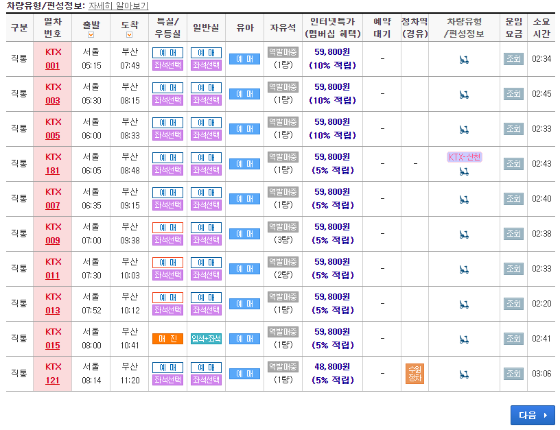 그리고 이제 승차권 예매를 해보도록 할텐데 마음에 드는 시간이 있다면 그 시간에 있는 좌석선택 버튼을 클릭하시기 바랍니다.