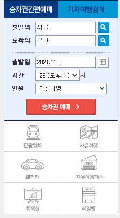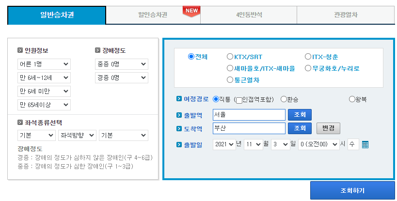 저는 출발역을 서울로, 도착역을 부산으로, 출발일은 2021년 11월 3일, 시간은 00시로 한 후 인원은 어른 1명으로 선택을 하였습니다.