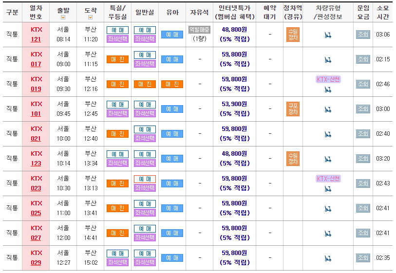 저는 ktx/srt를 클릭하였기 때문에 ktx와 srt만 검색이 됩니다.
