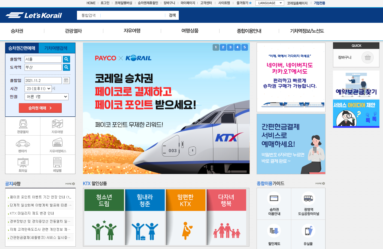 철도청 승차권 예매를 하려면 우선 레츠 코레일 홈페이지에 접속을 해주셔야 합니다. 레츠 코레일이라고 검색하시면 바로 접속하실 수 있을 것이며 주소는 letskorail.com 입니다.