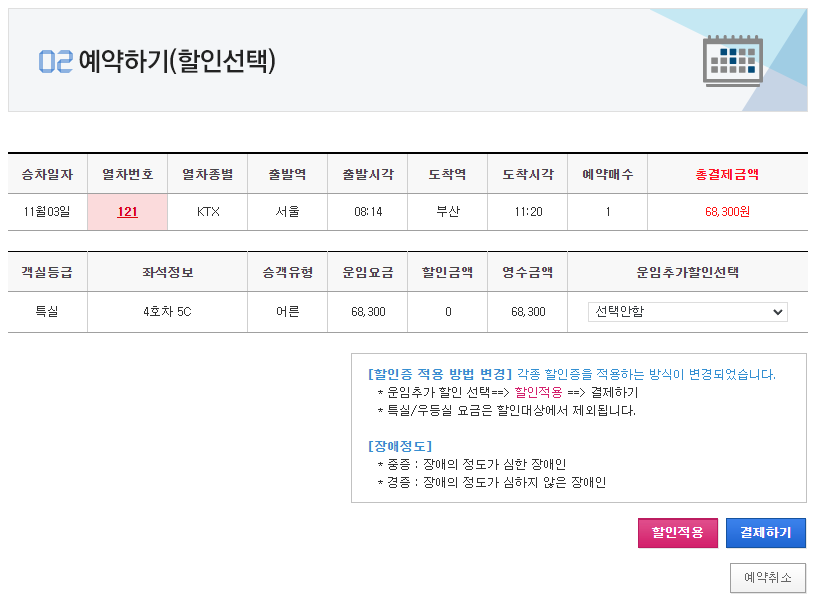 선택하신 후 승차권 예매 버튼을 클릭하시면 위와 같은 화면이 나올것입니다.