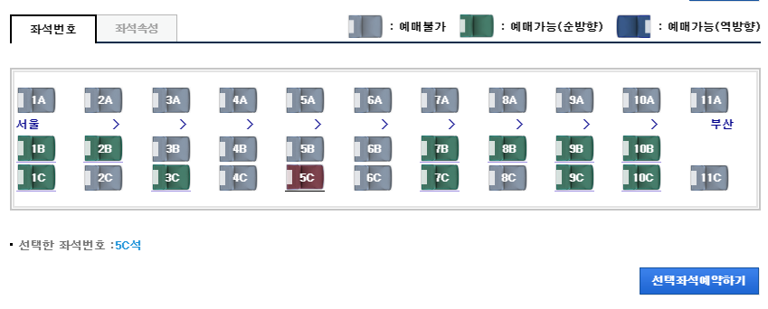 회색으로 되어 있는 좌석은 선택이 불가능하며 녹색으로 되어 있는 좌석은 예매가 가능한 좌석입니다.
