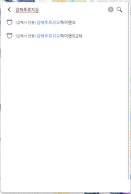 단지명을 김해푸르지오라고 입력하니 아래쪽에 그 단어가 들어가는 단지가 검색이 됩니다.