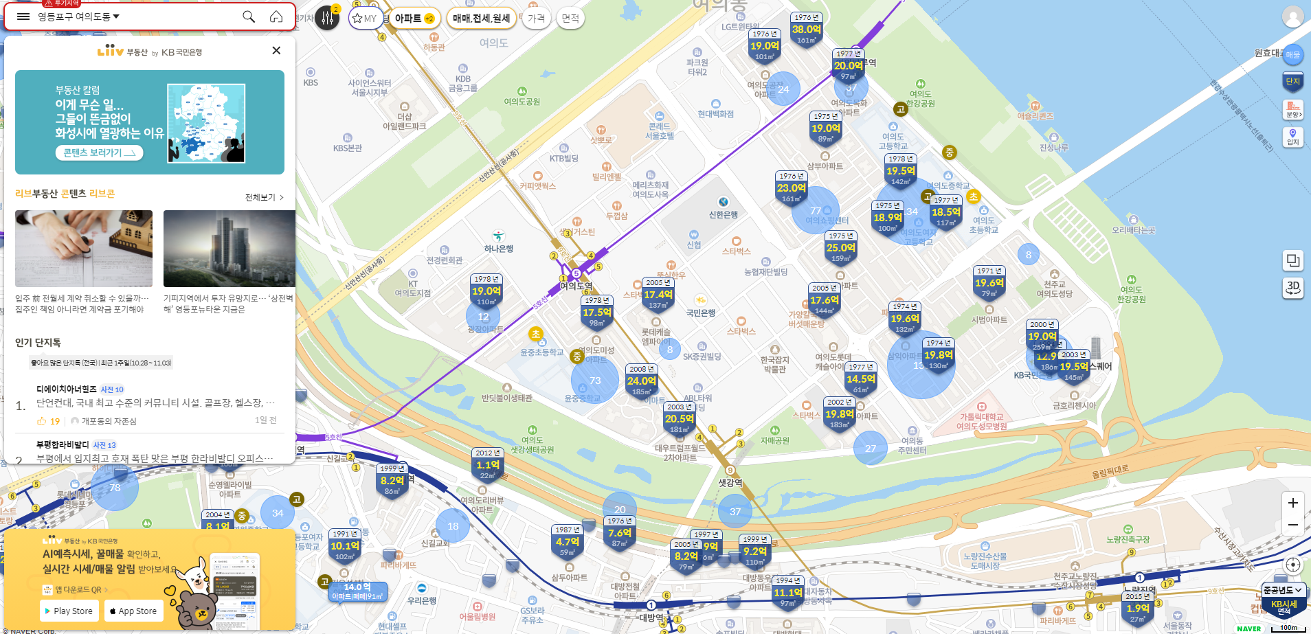 왼쪽 검색창을 클릭하시면 화면이 커지게 되는데 단지, 지역, 지하철, 학교 등 단어를 검색할 수 있게됩니다. 아파트 단지명을 검색해보겠습니다.